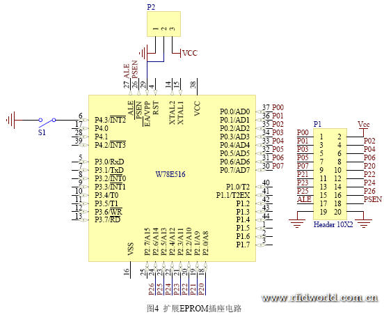 采用此種編程方法可以使我們不用購買專門的編程器就可以隨時對CPU 進行編程,而不用對CPU 進行插拔。這樣我們就可以使用無鉛封裝QFP44 的W78E516, 減小了板子的大小。另外一塊外置EPROM 板子可以對多塊電路板編程,而且只需使用一次即可,具有簡單,實用,成本低廉的特點。