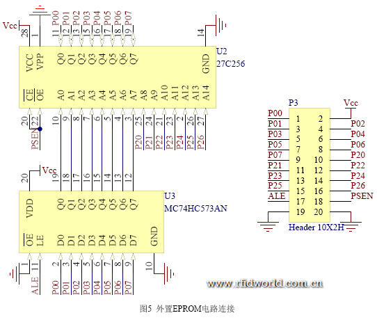 把在線下載程序燒寫到4K LDROM 后,拔掉外置EPROM, 把EA 跳到VCC,使P4.3為低,復位處理器讓處理器進入在線下載模式,在線下載程序通過串口配合上位機程序從上位機獲取要執行的程序寫入64K APROM。這樣我們就完成了對64K APROM 的ISP 編程。圖3 為擴展EPROM 插座電路圖。圖4 為外置EPROM 電路圖。圖5 為串口的電路連接。