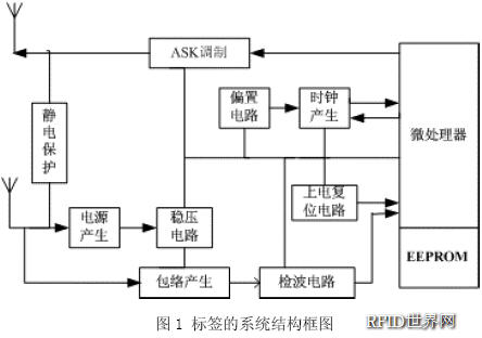 標簽由天線、模擬電路部分、數字電路部分和EEPROM存儲器組成。圖1示出了標簽的系統結構框圖。天線用于發射和接收電磁波;模擬電路主要是由包絡檢波電路、ASK調制電路、穩壓電路、時鐘產生電路、偏置電路以及上電復位電路組成,用于獲取能量并調制解調信號;數字電路內部包含控制邏輯、微處理器(CPU),用于控制相關協議、指令及處理功能;EEPROM存儲器用于存儲標簽的系統信息和數據,存儲時間可以長達幾十年,并且在沒有供電的情況下,其數據信息不會丟失。