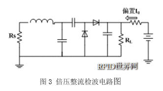 包絡檢波電路的作用非常重要,一方面要從射頻輸入端提供的信號提取包絡,并通過檢波電路進行解調,為數字電路提供數字基帶信號;另一方面還要從射頻信號中提取穩定的偏置電流和時鐘信號,供數字電路和調制電路使用。本論文設計了一種倍壓整流檢波電路,其等效電路圖如圖3所示,其中Rs為封裝電路的等效串聯電阻,RL為負載電阻。