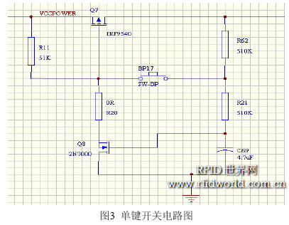 單鍵開關設計必須考慮到以下幾點:一是單鍵開關必須穩定,按一次鍵只有一次電源的通或斷;二是電流問題:因為單鍵開關無論是關機的時候還是開機的時候都要使用電源,所以必須保證其電流足夠小,減少電源的損耗。通過查找資料,我們設計了以下電路(圖3):
