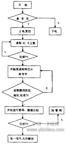 在主程序中:首先,實現判斷是否有卡插入,這通過調用消顫子程序來完成。在這個程序中不僅可以判斷是否有卡插人,如果沒有則進入下電子程序,處于等待狀態。如果有,則給上電、復位子程序,給IC卡加上電源通電。并初始化IC卡,都完畢后開始讀取卡中的數據,存在單片機指定的地址中,這一步是通過讀卡子程序來完成的。完成后,單片機進人中斷來讀取時鐘芯片中的日期數據,同樣存人單片機指定的地址之內。讀數據都完成后,便開始了數據比較程序,來判斷是否合法,用戶有沒有權利收看有線電視。這一步是最關鍵的,如果判斷出錯,則會給報警程序一信號,來告知用戶。如果合法,接下來單片機會給出一信號到達解擾模塊,準許它工作,解擾被加密的電視信號,以便讓合法用戶收看到正常的電視信號。