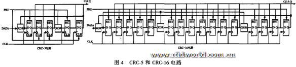 UHF RFID系統采用循環冗余校驗(CRC校驗)來判斷數據的有效性和完整性,CRC校驗可以保護讀寫器發出的RjT (reader to tag)命令和標簽反向散射的TjR (tag to reader)序列。從數學角度來看,CRC校驗是用將被處理的數據字節當作一個二進制多項式A ( )的系數,該系數除以發送方和接收方預先約定好的生成多項式g ( )后,將求得的余數P ( )作為CRC校驗碼。CRC的計算包括了要計算其CRC值的數據字節以及所有前面的數據字節的CRC值。當一個數據塊被傳輸時,數據發送方計算此數據塊的CRC校驗碼,并將此校驗碼附在數據塊后一起傳輸。數據接收方計算所有接收數據的CRC值,其結果總是零,否則在傳輸過程中一定出現了傳輸錯誤。用零校驗可以很容易地分析數據的完整性,避免代價很高的校驗和比較過程。協議中采用線性反饋移位寄存器來實現CRC校驗,CRC.5校驗和CRC.16校驗的電路示意圖如圖4所示。
