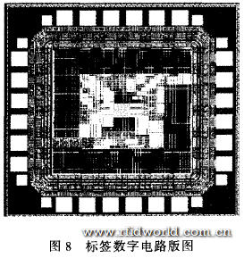 本文采用VHDL完成了UHF RFID標簽數字電路的RTL代碼設計,同時對標簽與讀寫器通訊過程進行全面的模擬和仿真,并基于0.18μm CMOS工藝標準單元庫,用EDA相關工具對該電路進行了前端綜合和后端物理實現。仿真結果如圖7所示,可以看到,綜合后的電路將讀寫器發出的PIE格式命令CMD data成功地譯碼為二進制數據,存人命令寄存器command中,并提供了控制狀態機及校驗模塊的相關命令的使能信號(Query en,QueryAdjust—en等);在各種命令使能信號的觸發下標簽執行相應操作,按讀寫器要求產生各種輸出數據(rn,handle等);并將輸出數據進行FM0編碼產生CMD out;還實現了與存儲器的接口。仿真結果顯示標簽數字電路在各情況下均正常工作,完全滿足協議要求。綜合后的電路規模約為11000門,功耗約為35μw。由于電路規模很大,要通過自動布局線進行版圖設計,所設計的版圖如圖8所示。版圖已經通過了DRC(設計規則檢查)和LVS(版圖與電路圖一致比較)驗證,時序分析也滿足要求,電路具有較大的裕量,可靠性較高。