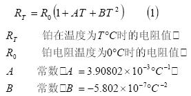 配對溫度傳感器選用經過精密配對的Pt1000 鉑熱電阻,測量溫度在0--850℃時,溫度與其阻值的滿足關系式: