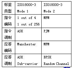 在RFID的各標準中,都存在一些較為特殊的定義,如Mode1支持兩種指令編碼,其應答信號是具有副載波二次調制的ASK;Mode2的指令調制為±1°~±2°的相位跳動調制,其應答調制為在8個可選通道中隨機選擇一個通道的BPSK。