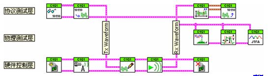 強大的測試軟件是虛擬儀器技術的關鍵,如前所述,該系統突破了傳統儀器受專有硬件限制的局限性,在軟件層實現了對RFID多標準的支持。結合NI模塊化硬件提供靈活的平臺,我們采用了層次化、模塊化的軟件構架,從而使系統功能適應RFID的測試需求。雖然RFID的各種標準之間,其編碼/解碼、調制/解調過程的具體實現方式都不盡相同,但通過模塊化的良好封裝,頂層的功能模塊都以統一的標準接口呈現給用戶。這樣使得現已支持的標準都能夠很好的整合在一起,并且為將來可能擴展的新標準支持提供了非常方便的接口。