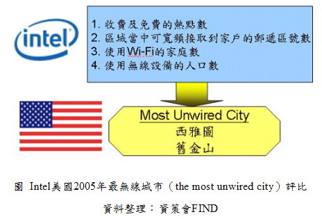 Intel于2005年1月至4月中旬,著手研究美國前100大城市無線網絡使用概況,并分析各城市無線熱點的利用情形。調查結果,西雅圖及舊金山被評為全美「最無線」的城市(the most unwired city),這兩個地區的計算機使用者可在餐廳、圖書館或公共廣場發送e-Mail及搜尋網絡上的資料。此次評比的衡量指針包括: