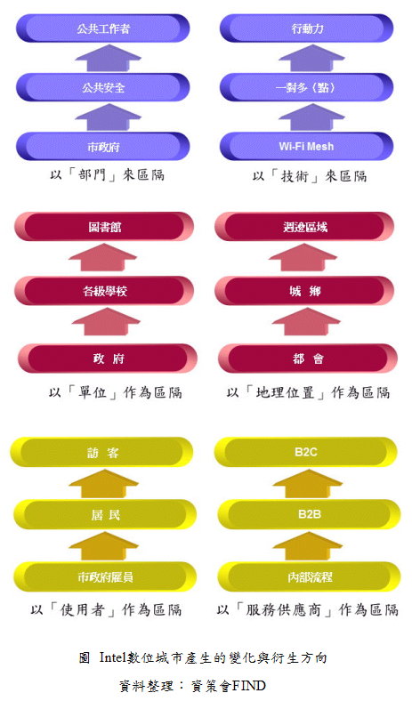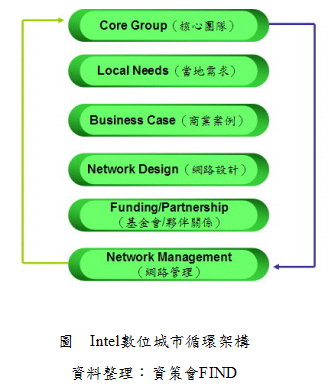 Intel針對數字城市的規劃,提供了一系列的循環架構,可以經由這些策略架構去分析與規劃數字城市的發展(如下圖):