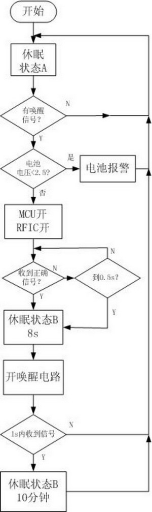 電子標簽平時處于休眠狀態,當喚醒電路接收到433MHz射頻信號時,向MCU發出喚醒信號,MCU被喚醒,立即喚醒RF模塊,進入接收狀態,檢測RF模塊有無信號,如無信號,標識電池電量不足。接收到正確信號后,MCU關閉RF模塊,使其進入休眠狀態,并關閉喚醒電路,設定8s延時,防止在同一標識區重復喚醒,MCU進入休眠狀態,定時喚醒后,MCU打開喚醒電路,進入下一次接收狀態。當1s內接收到喚醒信號,則再設10分鐘延時,關閉喚醒電路,防止在同一標識區重復喚醒,在此期間MCU和RFID處于休眠狀態。然后進入接收狀態。流程圖如圖4。
