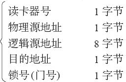 讀卡器號用于讀卡器地址和門號的對照;物理源地址表示持卡人所在區的區號;目的地址表示持卡人要前往區的區號;邏輯源地址是在要防反傳時用的,表示持卡人可直接從這些區到該讀卡器讀卡. 每1bit 表示一個區,為1 時表示有效,為0 表示無效,最多可表示64 個區.