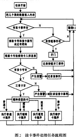 讀卡事件處理任務的過程:首先,采集數據的中斷服務程序發來的事件標志激活該任務,從緩沖池中讀取卡號和讀卡器號,或者還有密碼;其次,根據卡號、讀卡器號和當前的讀卡時間,到持卡人信息表、讀卡器表、群組表里去檢索信息;然后,根據群組表里的門屏蔽字去查門的時段表、門的時段屬性;最后,根據所得信息執行命令并保存事件內容、修改使用次數和人員位置數據等. 該任務的優先級為200 ,用獲取信號量的辦法與網絡接收數據任務互斥開. 因為該任務涉及到幾個表,數據量比較大,所以堆棧空間較大,為500 K.通過發巡更事件與巡更任務通信[3 ] . 超級卡程序比普通卡的程序少一項時段判斷的過程,其它的與普通卡程序一樣;維護卡程序實現解除門控器防拆報警使之恢復正常工作狀態;巡更卡程序發送巡更標志給巡更任務. 關于是否違反防反傳規定,要視具體工程和客戶的要求而定.