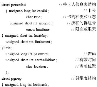 群組號表示該持卡人屬于哪個群組. 時限有限天、限次和既限天又限次3 種. 其中時限中的限次和持卡人當前位置在程序中動態變化,其它項在程序中固定不變. 以上每個持卡人信息占用16 個字節,按10 000人計算,共占用160 K字節.