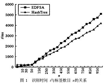 根據EDFSA算法和散列樹形搜索反碰撞算法的基本思想,編寫了仿真程序。在仿真環境下, EDFSA初始幀長度為10,兩算法最大幀長度為256時,系統識別總時間隨著標簽數目的變化情況如圖1所示。當標簽數目小于60時, EDFSA算法總體識別時間小于散列樹形搜索反碰撞算法的總體識別時間,這是因為散列樹形搜索反碰撞算法初始幀長度為59,標簽數小于59時,可能浪費時隙。當標簽數目大于60時,兩種算法的系統總體識別時間與標簽數目呈線性關系。這說明兩種算法在標簽數目大于最大幀長度時,都有分組標簽的作用,限制了響應標簽數,使識別時間與標簽數目保持線性關系。但兩條曲線的斜率不同,在標簽數目較多時,散列樹形搜索反碰撞算法優于EDFSA算法,這是因為散列樹形搜索反碰撞算法有較高的識別效率。
