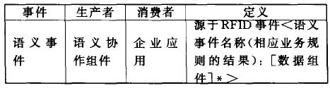 表2 語義事件定義語義協作組件負責將RFID事件轉換為語義事件。轉換過程是這樣的,對RFID事件進行收集,獲取相關的數據,分析相應的業務規則,最終產生語義事件。為產生語義事件,首先必須在活動中描述語義事件的規格。我們用語義事件定義語言來描述這一規格,這在下面會繼續進行說明。