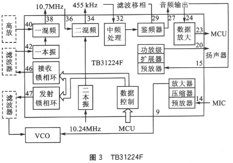 TB31224F的42~46腳配合一個高頻感容網絡構成第一本振電路,一本振頻率受TB31224F的6~8腳上來自MCU的鎖相環數據信號控制。從46腳輸出的鎖相環控制電壓經積分電路后送入4l腳,41腳內接變容二極管的負極,變化的控制電壓改變了變容二極管結電容,從而政變一本振頻率。第一本振信號經44腳送入42腳,與內部的參考頻率比較而使46腳的控制電壓鎖定,也就鎖定了一本振頻率。第一本振信號與輸入40腳的外來信號混合后從38腳輸出10.7 MHz的第一中頻信號;經陶瓷濾波器(10.7 MHz)選頻后送入36腳,與第二本振信號混合,差頻出455 kHz的第二中頻信號從34腳輸出;經窄帶濾波將純凈的455 kHz信號送入32腳,再經內部限幅放大、鑒頻、解調出復合音頻信號(語音和數據共用一個信道)。鑒頻輸出的語音信號和數據信號從27腳輸出后分兩路進行:一路送入24腳放大后,從23腳輸出數據信號RX-DATA送MCU處理;另一路送入15腳,經內部預放、擴展、放大后從19和20腳輸出語音信號加至耳機。