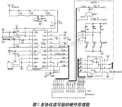 如圖2所示,多協議讀寫器的硬件構成:單片機ATmega16、MLX90121、讀寫器接口電路。天線的設計本文不作討論。