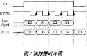 圖3中,MLX9012l將從標簽中讀到的信息取出后生成輸入信號(input signal),經過大數判決(MV,majority voting)電路啟動,在時鐘(CK)上升沿開始由DOUT 口向MCU發送數據,發送時采取低位先送。在每個數據同步信號(DSYNC)下降沿取出數據。在最后一個DSYNC信號上升沿,CK信號拉低結束數據輸出。