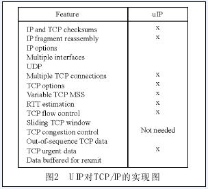 UIP的特點是代碼量和數據量都比較小, 因而可以為存儲器比較緊張的地方提供合適的實現方案, 包括TCP/IP所需的最小實現方案和只包含TCP、IP、ICMP (ping) 以及簡單的UDP協議, 其具體的實現方法如圖2所示, 圖2中, 帶“×”的表示已經實現。