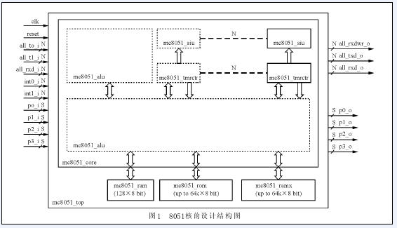 在8051核的FPGA設計中, 完全可以實現包括計時/計數、中斷、串口、數據及程序存儲器、特殊寄存器、布爾處理的位處理機等的所有功能, 而且兼容所有指令, 只是在具體的移植過程中做一些改變而已。