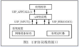 為了UIP協議棧能具有最大的通用性, 在實現時可將底層硬件驅動和頂層應用層之外的所有協議集“打包”在一個“庫”里。協議棧通過接口與底層硬件和頂層應用進行通信。通過這種方式可使uIP具有極高的通用性和獨立性, 以便移植到不同的系統和方便地實現不同的應用, 很好的體現TCP/IP協議平臺無關性的特點。UIP協議棧與系統底層和應用程序之間的接口如圖3所示。圖中, 各接口之間都是由一系列函數來實現的。