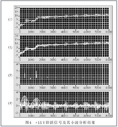 (3) 為信號的第8級分解小波模極大值圖; (4) 為信號各級 (共9級) 的高頻分量即小波系數。