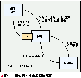 基本的RFID系統一般由3部分組成:標簽、閱讀器以及應用支撐軟件。中間件是應用支撐軟件的一個重要組成部分,是銜接硬件設備如標簽、閱讀器和企業應用軟件如企業資源規劃(ERP)、客戶關系管理(CRM)等的橋梁。中間件的主要任務是對閱讀器傳來的與標簽相關的數據進行過濾、匯總、計算、分組,減少從閱讀器傳往企業應用的大量原始數據、生成加入了語意解釋的事件數據。可以說,中間件是RFID系統的“神經中樞”。