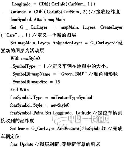 車輛在電子地圖上的實現是通過增加新的層,并把新層設置為活動層,然后在新層上增加新的特性,新的特性的顏色、形狀、大小可以按照自己的要求定義,最后把它顯示在地圖上。在車輛運動過程中,根據接收到的不同信息,可以將車輛定位到不同的位置,然后刷新地圖就能實現車輛的移動。如下面的程序: