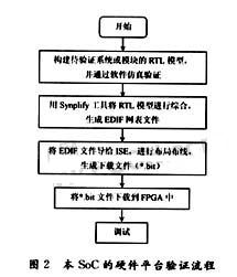 在對本SoC進行硬件平臺驗證過程中,采用的FPGA綜合工具是Synplicity公司的Synplify Pro 7.7,FPGA布線工具選用的是Xilinx公司的ISE 5.0,硬件平臺的核心FPGA芯片選用的是Xilinx公司的Virtex II系列的XC2V2000。驗證流程如圖2所示[1-3]。