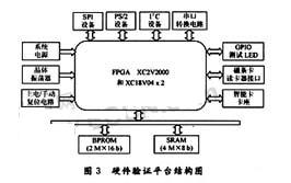 本SOC芯片內部采用AMBA總線,內嵌32 b整數處理單元,優化的32/64 b浮點數處理單元,并且內嵌了大量的外設,主要包括:80位GPIO口、4路UART控制器、5個24 b定時器、看門狗、.PS/2控制器、I2C總線控制器、SPI總線控制器、1個三磁道磁卡控制器,3個智能卡控制器等。為了完整地測試本SoC的所有功能,硬件測試平臺如圖3所示,包含下列基本組成部分: