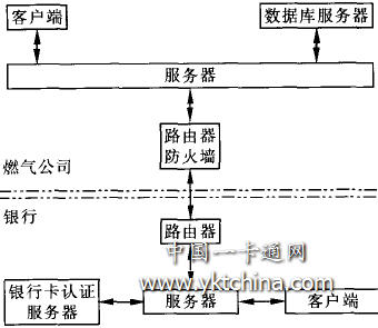 硬件系統主要由2臺服務器、若干臺PC機和讀寫卡器、與銀行聯網的光纖、路由器、防火墻等組成。硬件系統的結構見圖2。