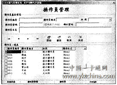 要添加新的操作員或管理員,應依次填寫操作員代碼、操作員姓名、操作員密碼、確認密碼、權限(有操作員、管理員和無權限三類)及日志(可以不填寫)等內容,最后單擊添加按鈕,則新的操作員生成。