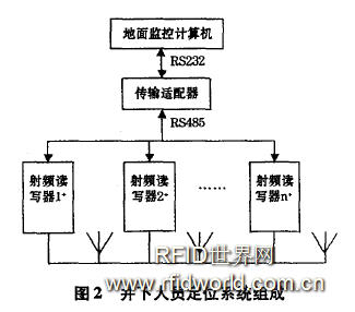定位系統由軟件系統和硬件系統組成,其中軟件系統包括應用軟件和嵌入式軟件兩部分組成,用于完成信息采集、識別、加工及其傳輸,由這兩部分軟件共同支撐著整個系統的運行,并演繹出各種不同的應用系統。硬件系統由地面監控計算機、傳輸適配器、射頻讀寫器、射頻識別卡和天線組成,用于完成信息采集和識別,從而實現人員識別、定位的功能。各部分功能如下。