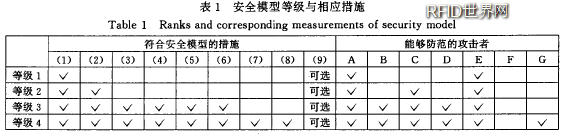 隨著RFID標簽芯片對于安全防范功能的增加,芯片硬件變復雜面積增大,從而帶來成本的增大.為了降級RFID標簽芯片成本,充分利用RFID芯片資源避免浪費,使不同應用的標簽能夠根據需要滿足其安全要求.在考慮RFID標簽的各種應用環境和用途、所附著物品的成本以及社會因素后,本模型將RFID標簽根據應用需要的安全劃分為以下四個安全等級,在各個等級中規定標簽應支持的安全防范措施.以自然數的較小數字代表安全性要求較低的等級,以較大自然數代表安全性要求較高的等級.對于各等級下能夠防范的攻擊者如表1所示.