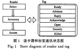 在EPC C1 G2的協議中,reader通過三種基本操作:Se—lect,Inventory和Access管理標簽群.同時根據讀卡器的操作,標簽工作于七種狀態模式:Ready,Arbitrate,Reply,Ac—knowledged,Open,Secured和Killed.其中處于Killed狀態下的標簽,將處于死亡狀態,不可被喚醒,如圖1讀卡器和標簽通訊狀態圖所示.