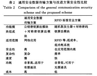 在通用安全數據傳輸方案中[”],采用公鑰密鑰加密算法來進行通訊雙方的身份認證,但是由于公鑰制加密算法的實現電路面積較大,占有較高的功耗和處理時間,不能使用于類似RFID標簽的低功耗電路中.本安全方案中采用隨機數發生器和對稱密鑰加密算法來保證RFID標簽的數據安全,這種安全算法具有功耗低,速度快和實現電路面積小等特點.這兩種安全方案的比較如表2所示: