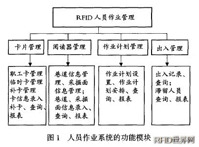 人員安全管理強調井下作業過程中人員的安全,通過計算機查詢等功能,了解人員的具體位置分布,可通過圖形突出顯示。發生事故時,可有效地進行搶險救災工作,最大限度地保障人員安全。人員作業管理是利用RFID的識別功能進行的。系統首先要生成閱讀器和卡片等相關信息,通過系統軟件對識別后的數據進行處理。人員作業系統按照功能劃分為4個模塊:卡片管理、閱讀器管理、作業計劃管理和人員出入管理,如圖1所示。