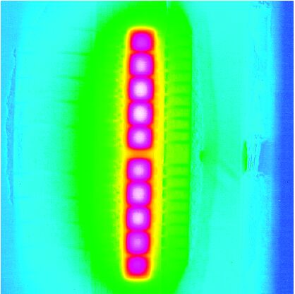 為獲得封裝晶體管的熱阻,飛思卡爾制訂了一套嚴格的方法,采用紅外線(IR)顯微鏡來測量工作在實際節點阻抗和信號激勵下的晶體管裸片的溫度。在顯微鏡下,裸片的溫度分布可以被看成是功率大小、偏置、匹配條件、頻率,甚至是所選擇的調制方式(例如WCDMA或IS-95)的函數。晶體管消耗60W功率的IR圖像照片如圖11所示。