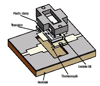 使用IR顯微鏡可以定位出測量區域的最大裸片表面溫度。在熱測量期間,可以確定封裝晶體管的底部的溫度,并通過熱電偶進行監測,或者直接在晶體管的活動單元或產生熱的區域進行定位,如圖12所示。可通過在晶體管的陶瓷蓋上鉆孔,或者除去蓋子來直接觀察裸片表面。對OMP封裝,可以刻蝕掉模壓封裝使裸片的表面暴露出來。