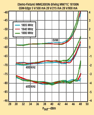 圖13為其中一個示范電路。這個電路被用來演示完整的1,800MHz GSM產品系列,包括驅動MW7IC18100N大功率RF的ICMMG3005 GPA。MMG3005是A類偏置InGaP HBTC,在1dB壓縮下具有+30dBm額定輸出功率。MW7IC18100N是HV7 LDMOS兩級RF IC,在1dB壓縮下具有100W(+50dBm)的額定輸出功率。綜合來看,這兩個器件創建了高性能的1,800MHz GSM系統,具有近50dB的增益、37%的線路效率,以及+46dBm輸出功率下的1.5% EVM性能,如圖14和15所示。低成本塑料封裝、緊湊的電路版圖以及使用最少的RF器件使得這一應用為成本敏感的GSM市場提供了理想的解決方案。