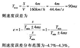 2) 檢測速度誤差:每路線圈檢測計數時間約為2.5ms,達到計數值后單片機定時器記錄時間值,然后進行判斷等操作,這段處理程序大約300500行,按一行 C語言折合3行匯編指令算,最多1500條指令,指令周期為lus,時間需要1500x1us=1.5ms,可得出每路檢測時間約為4ms,即最大時間誤差為4ms。速度線圈對著的中心間距為4m,按檢測速度160km/h計算,則通過兩線圈最短時間為: