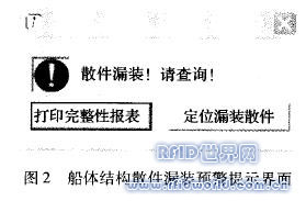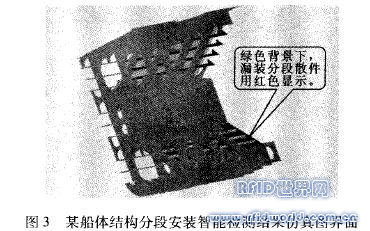 系統的工作原理為,在電子標簽中輸入分段散件的相關信息,包括散件電子編碼、船廠散件編號、分段號和散件規格型號等,這些貼上電子標簽的分段散件在分段完工前上船臺安裝,安裝前,由RFID便攜式識別器自動讀取位置信息,快速顯示散件的安裝位置,工作人員根據安裝位置的不同進行快速分揀;安裝后,RFID識別器在船臺上再次采集安裝信息,并快速傳輸到自動檢測系統,如果有漏裝現象,系統會馬上給出預警提示,如圖2所示,并根據需要顯示漏裝件的數量、規格型號以及漏裝位置,并通過CAD軟件以三維仿真圖像直觀顯示漏裝件所在位置。某船體結構分段安裝智能檢測結果仿真圖如圖3所示。