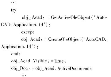 (2)Delphi前臺開發與AutoCAD-I 具軟件的接口。AutoCAD從R14版開始引入了Automation技術,它把全部的系統功能和函數打包成為一個名為AutoCAD.Application.1 4的Automation Server對象。通過這個對象,應用程序可以訪問Auto—CAD全部功能。本系統軟件的開發對于此部分的接口擬采用該種方式予以實現。