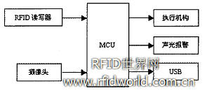 系統主要由MCU、RFID讀寫器、門禁執行機構、攝像頭及報警器等模塊組成。通過相關軟件的控制,實現對實驗樓出人口人員進出統一管理。其系統結構如圖2所示。