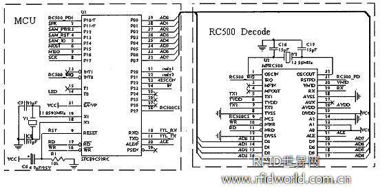 該系統的關鍵部件是讀寫器,它由微處理器、外圍擴展器件、讀寫芯片、射頻天線、串行通信接口等幾部分組成。接上串行口和+5V電源之后不僅可以讀卡而且可以與計算機進行通信。讀寫器是由STC89C52RC型單片機控制專用讀寫芯片(MFRC500)組成。其系統原理圖如圖3所示。當校園卡(電子標簽)置于讀寫器上時,讀寫器中的讀卡芯片MF RC500立即讀取該卡的卡號并選通讀寫器控制器STC89C52RC,通過三層身份驗證,讀取卡內數據形成用戶號,并將該用戶號傳給PC機客戶端程序,應用程序連接后臺數據庫用戶信息表獲取與該卡號對應的讀者信息。如果身份合法,則通道打開并提示歡迎信息,應用程序產生進門刷卡記錄存儲于數據庫中,否則提示出錯、拒絕進入。