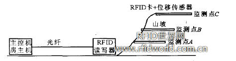 系統總體由位移傳感器、射頻識別系統(RFID)和主控機房構成。其工作原理為:將帶有RFID卡的位移傳感器植入山坡的監測點A、B、C等中。當其中某點發生位移時,其相應的RFID卡將會發射攜帶有自身唯一標識的ID號,RFID讀寫器會接收到這些信息并通過網絡傳入到主控機房主機中,供監控人員處理。其原理如圖1所示。