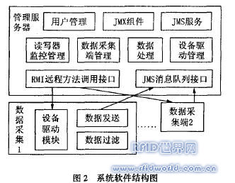 本系統基于J2EE技術開發,其中組件管理基于JMX管理框架,包括:讀寫器組件、數據采集端組件、數據處理組件等;RFID數據消息的傳遞基于JMs消息服務體系。