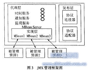 讀寫器監控和管理模塊基于JMX管理框架,將讀寫器開發包用統一接口進行封裝,并將接口方法作為RMI遠程方法發布。對讀寫器的控制是在管理服務器中進行的,將對讀寫器的遠程方法調用封裝為一個MBean組件,注冊到服務器中的JMBeanServer中,這樣可以通過JMX管理框架來監控管理讀寫器。通過封裝,以編程的方式彌補了不同廠商讀寫器開發包不同的差異,將對讀寫器的控制封裝成接口統一的MBean組件。另外,JMX管理框架還提供時間服務、通知服務、監視服務和角色服務等服務。JMX管理框架如圖3所示。