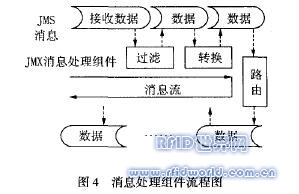 數據消息處理模塊基于JMS消息服務體系,這種組件體系結構將支持任意數據處理過程。業務分析人員可以對數據處理過程進行建模。一個數據處理過程實際上就是一些步驟的聚集。這些步驟包括數據過濾、格式轉換、路由等。每一個類別將被抽象,并且建模成為一個JMX組件,如圖4所示的消息處理組件的流程。