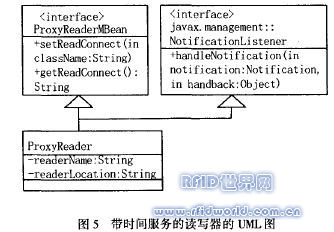 在本系統中將每個讀寫器模塊的遠程方法調用封裝為一個管理組件(MBean)作為JMX服務器的實例注冊到JMX服務器中。通過JMX框架對讀寫器進行監控和管理,使RFID中間件系統能提供管理、監控讀寫器的功能。本部分描述為讀寫器管理組件添加時間服務,以達到定時控制讀寫器的目的。JMX時間服務在指定的日期和時間觸發消息;也可以在一個固定間隔重復觸發消息。時間服務由一個MBean實現并可以管理,能夠發送它指定的TimerNotification類的消息實例。javax.management.NotificationListener由想要接收通知的對象來實現,實現方法handleNotification。對于定期通知,則使用固定延遲執行方案,如在Timer中指定的那樣。為了使用固定速率執行方案,要使用addNotification方法。圖5為讀寫器時間服務的UML設計圖。